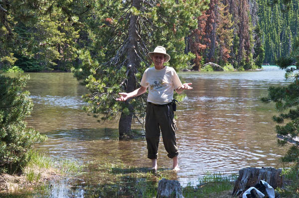 We headed up Cascade Lakes Highway past Mount Bachelor to the Green Lakes trailhead. I think this is our favorite day hike ever. It’s 4.5 miles in to the Green Lakes, following a nice rushing (actually, today it was roaring with snow melt) stream. We made it in a couple of miles to where the trail was completely covered with snow. From that point, the trail ascends steeply up switchbacks, and we thought that would not be too enjoyable. It was surprising to still have snow. Apparently, there were some late, heavy snow storms.