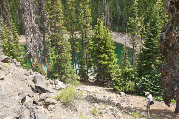 Doing ourselves no favors, after returning to the car we drove to the Mirror Lakes trailhead and then bushwhacked though forest and lava ridges to PMOGUY’s Swimming Hole (rated a T4). That was about a 1.2 mile round trip to a small round pond with no surface inlet or outlet. We were hot enough to swim, but the surface of the lake wasn’t very appealing, with a lot of pollen and debris.